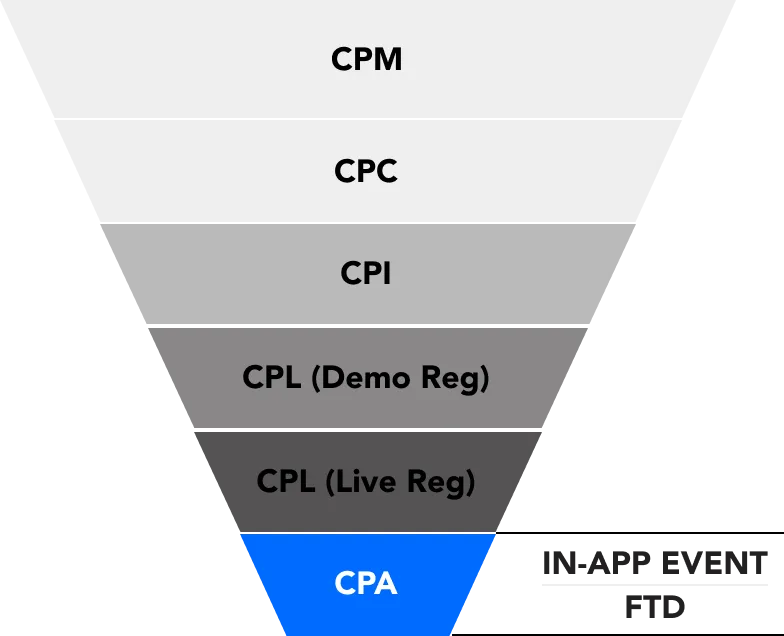 Este programa está diseñado para agencias de publicidad con técnicas de marketing digital notables para ser pagadas en base a costo por acción (CPA). Las agencias de publicidad con una cuenta de agencia válida en AppsFlyer pueden implementar su estrategia de marketing digital para lograr una acción especificada (depósito en la aplicación) y recibir pago por acción adquirida.